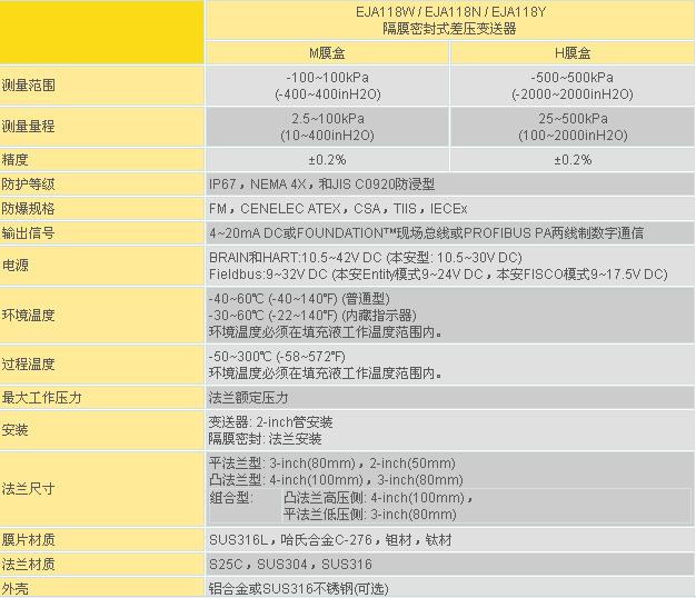密封隔膜是用于防止过程介质直接进入差压变送器的压力传感器组件中,它们是通过注满流体的毛细管与变送器连接的。EJX118W、EJA118N和EJA118Y型隔膜密封式差压变送器用于测量液体、气体或蒸汽的流量以及液位、密度和压力,然后将其转变成4~20mA DC的电流信号输出。EJA系列支持BRAIN、HART和FOUNDATION™现场总线或PROFIBUS PA通信协议。